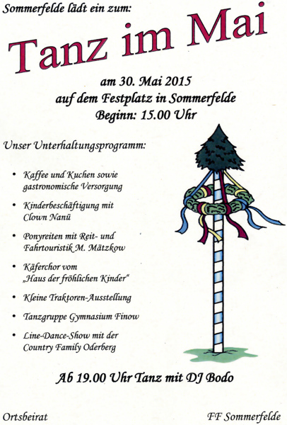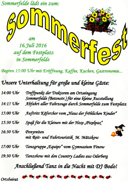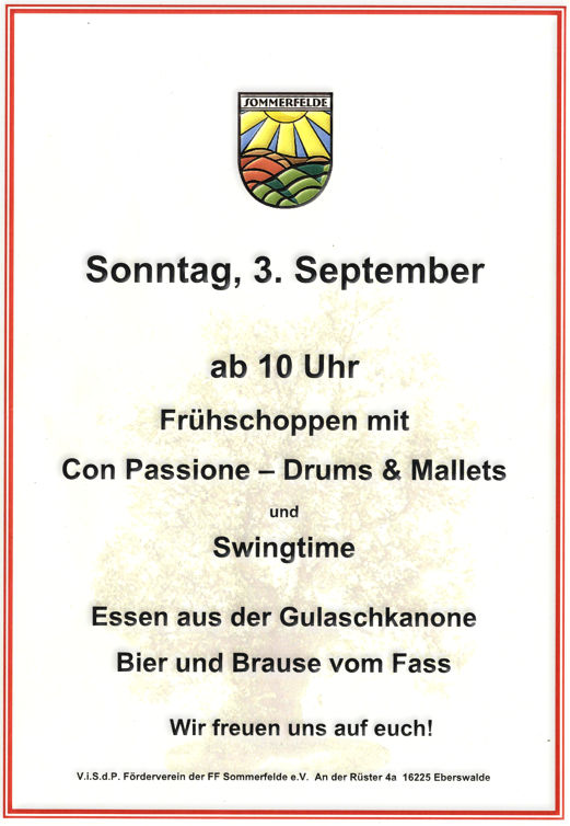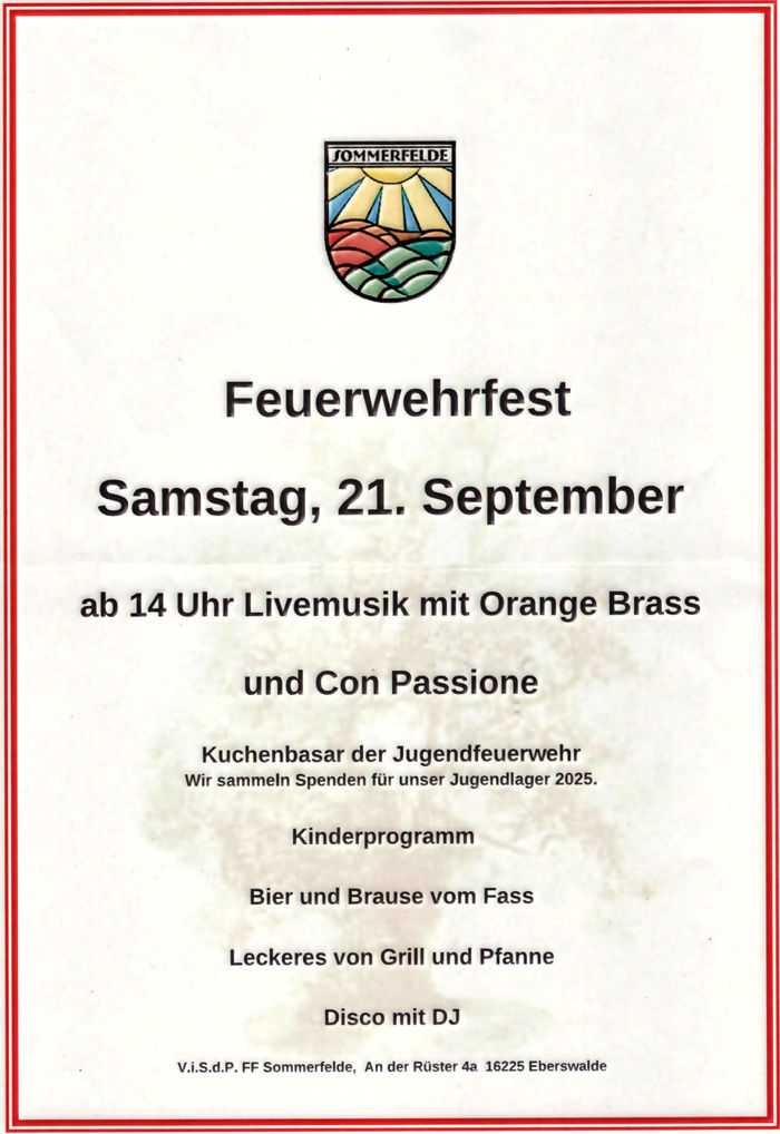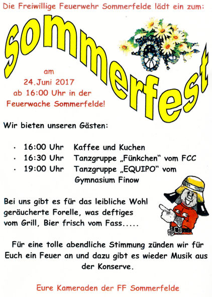 | 90 Jahre FF Sommerfelde Termin: Sa. 07. September 2013 Beginn: ab 15:00 Uhr Die Kameraden der Freiwilligen Feuerwehr Sommerfelde laden anlässlich des Jubiläums zu Ihrer Feier ein. Ab 15:00 Uhr können alle Besucher Feuerwehr erleben, anfassen und vieles ausprobieren. Für die Kleinen kann es dann mit Ponyreiten, Hüpfburg und Kinderschminken weitergehen. Für das leibliche Wohl steht Kaffee und Kuchen bereit. Geräucherter Fisch, Gegrilltes und Freibier vom Fass gibt es außerdem. Ab 19:00 Uhr ist dann Tanz mit DJ Bodo Derkow. Die Kameraden der FF Sommerfelde |
