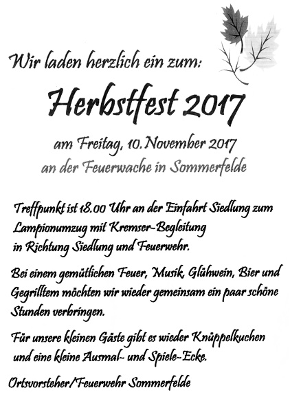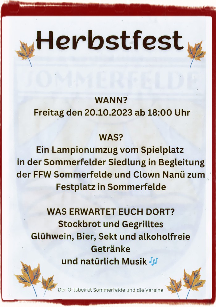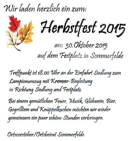 | Einladung zum Familien-Herbstfest Termin: Fr. 25. Oktober 2019 Beginn: ab 18:00 Uhr Lampionumzug ab Kreuzung Sommerfelder Siedlung, dann auf dem Festplatz (Zu den Tannen), ![]() |