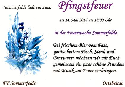| Pfingstfeuer 2016 Termin: Sa. 14. Mai 2016 Beginn: ab 18:00 Uhr ![]() | 14.01.2016 |