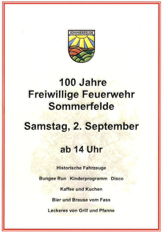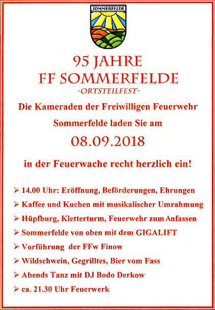 | Einladung zum Jubiläumsfest der Freiwilligen Feuerwehr Sommerfelde Termin: Sa. 08. September 2018 Beginn: ab 14:00 Uhr ![]() |