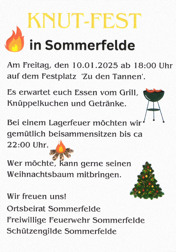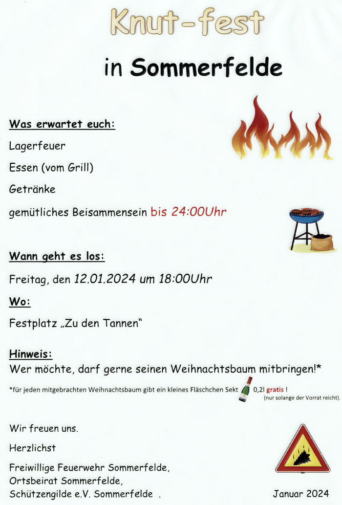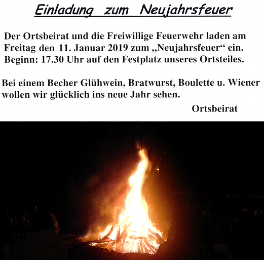 | Neujahrsfeuer Am 10. Januar wollen wir gemeinsam das neue Jahr mit Ihnen bei Glühwein und Bratwurst begrüßen. Wir laden Sie ganz herzlich ab 18:00 Uhr zum Neujahrsfeuer auf dem Festplatz unseres Ortsteiles ein. Ortsbeirat / Schützengilde / Freiwillige Feuerwehr |