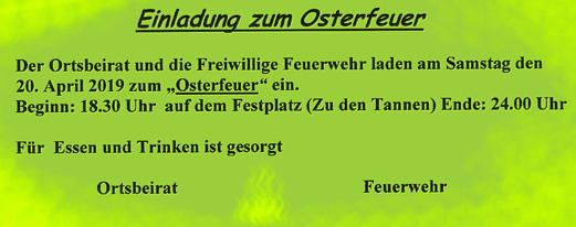 | Einladung zum Osterfeuer Termin: Sa. 20. April 2019 Beginn: ab 18:30 Uhr ![]() |