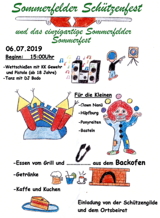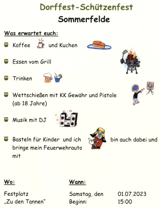 | Schützenfest Termin: 03. Juli 2010 Beginn: 15:00 Uhr Auch im diesem Jahr wird unser traditionelles Schützenfest wieder stattfinden. Los gehts am Samstag schon um 15:00 Uhr. Wie immer wird der beste Schütze ermittelt und der Schützenkönig gekrönt. Für die Kids haben wir diverse Beschäftigungen organisiert, auch Ponyreiten und Disco von Beginn an. Am Abend gibt es Tanz bis in den Morgen mit der Leo Cober Band. Ort ist wie immer der Festplatz in Sommerfelde. |