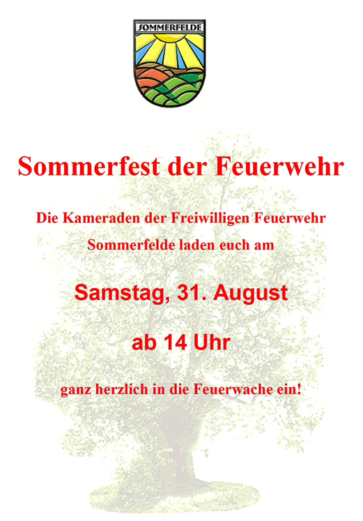 | Einladung zum Sommerfest der FF Sommerfelde Termin: Sa. 11. August 2012 Beginn: ab 15:00 Uhr Die Kameraden laden Sie herzlich ein auf das Gelände der Freiwilligen Feuerwehr in Sommerfelde. Am Nachmittag wird Kaffee und Kuchen gereicht. Die Feuerwehr steht zum Anfassen und ausprobieren bereit. Es wird Ponyreiten und vieles mehr geboten. Für das leibliche Wohl am Abend (geräucherter Fisch, Bratwurst, Bier vom Fass...) beim gemütlichen Zusammensein, mit musikalischer Umrahmung, ist gesorgt. Die Organisatoren |