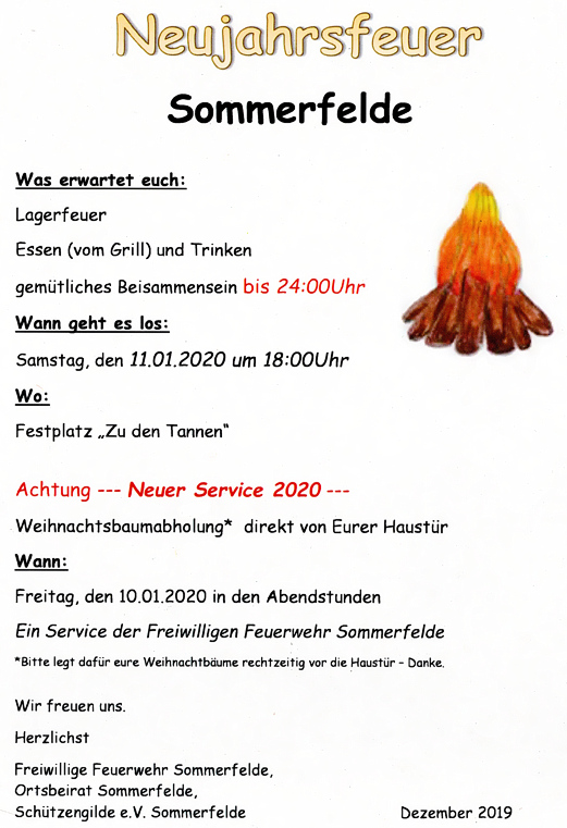 | Einladung zum Neujahrsfeuer / SERVICE-INFO Termin: Sa. 11. Januar 2020 Beginn: ab 18:00 Uhr auf dem Festplatz (Zu den Tannen), ![]() |