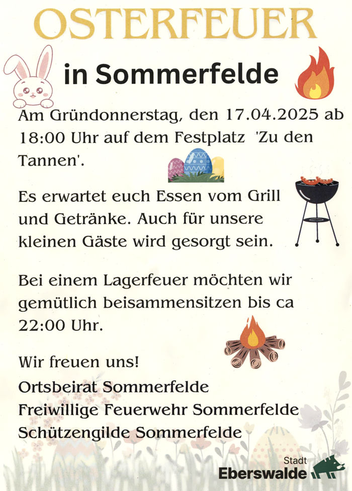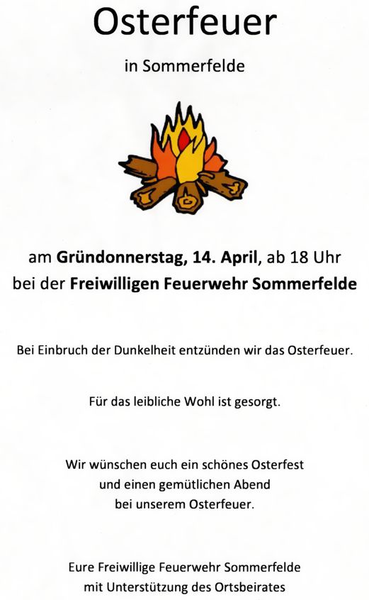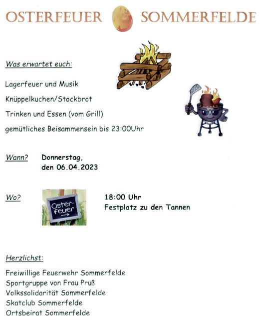 Osterfeuer Termin: Do. 21. April 2011 Beginn: 19:00 Uhr Unser nunmehr schon zur Tradition gewordenes Osterfeuer, findet wieder für alle Sommerfelder und Ihren Gästen am Donnerstagabend auf dem Festplatz statt. Neben einer echten ungarischen Gulaschsuppe, Bratwurst und Rippsteak, sorgen die Veranstalter auch mit Glühwein, Bier, Rot-, Weisswein und Sekt für die richtige Einstimmung ins Osterfest. Wir freuen uns auf Ihren Besuch. Ortsbeirat / Schützengilde / Freiwillige Feuerwehr |