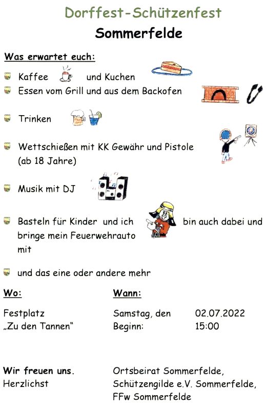 | Einladung zum Schützenfest Termin: Sa. 18. August 2018 Beginn: ab 14:30 Uhr Auch dieses Jahr findet unser traditionelles Schützenfest auf dem Festplatz wieder statt. Was erwartet Sie dieses Jahr: • Kaffee und selbstgebackener Kuchen, Bowle... • Pony-Reiten • Basteln für die Kleinen • Musik und Tanz. Die besten Schützen im KK-Gewehr und KK-Pistole werden ab 14:30 Uhr ermittelt. Höhepunkt gegen 20 Uhr ist die Krönung des diesjährigen Schützenkönigs. Anschließend gibt´s Musik aus der Konserve. Für eventuell einsetzenden Regen werden auch Festzelte aufgebaut. Die Schützengilde e.V. Sommerfelde |