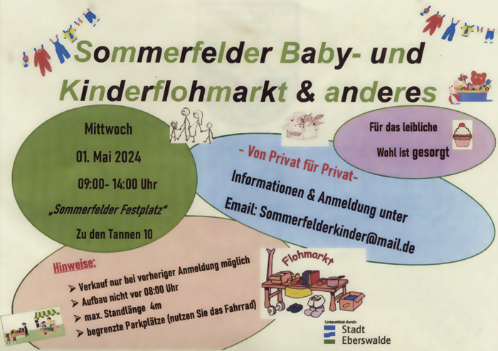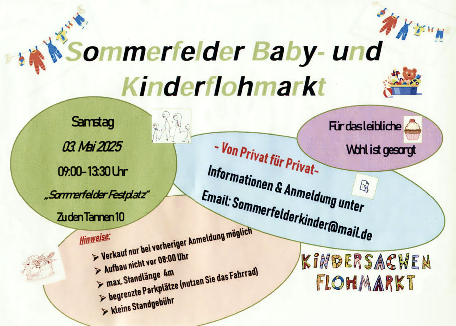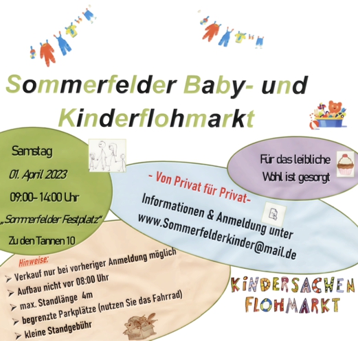 | Sommerfelder Baby- und Kinderflohmarkt Termin: Sa. 01. April 2023 ab 9:00 Uhr ![]() |