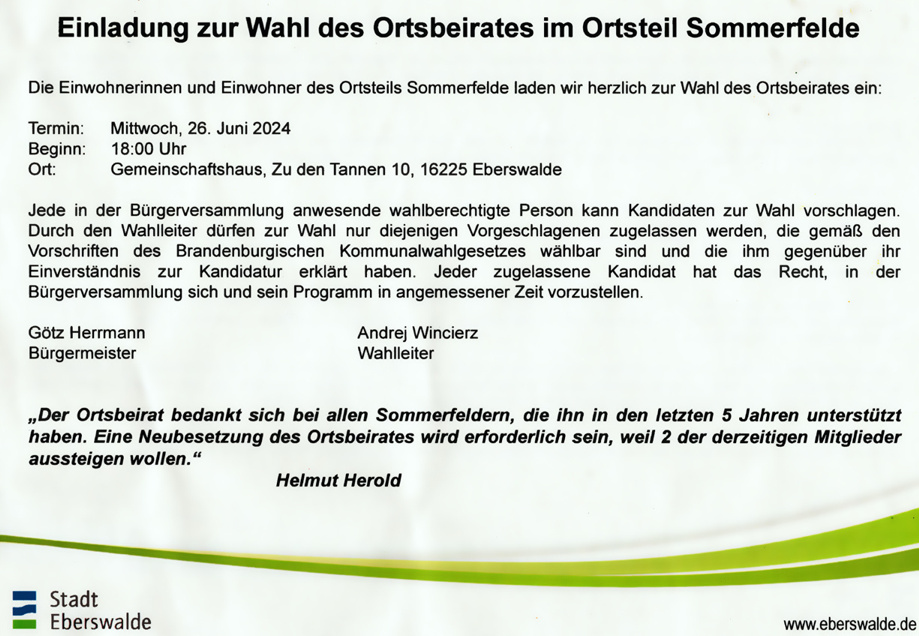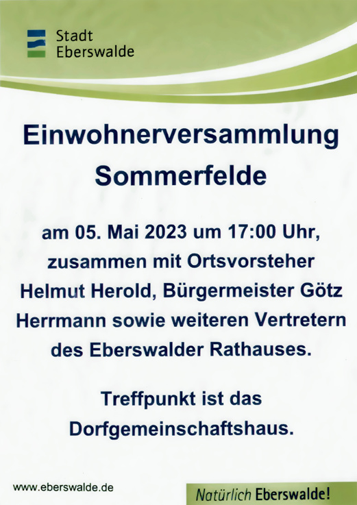 | Treffen zum Thema "Spielplatz Sommerfelder" Termin: Mi. 04. April 2012 Beginn: ab 17:00 Uhr Das Treffen findet am Feuerlöschteich der Sommerfelder Siedlung statt. Es werden Inhalte zum Stand der bisherigen Aktivitäten bekanntgegeben und Unterstützung bei der Umsetzung/Gestaltung erörtert. Alle Interessenten sind gebeten bis zum 30.03.2012 per E-Mail Ihre Teilnahme an dem Treffen zu bestätigen. Die Kontaktdaten finden Sie auf dem Infoblatt in Ihrem Briefkasten vom Sonntag, den 25.03.2012. Ihre Ansprechpartner sind Frau Herold-Woigsch und Herr Herold |