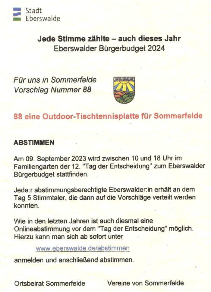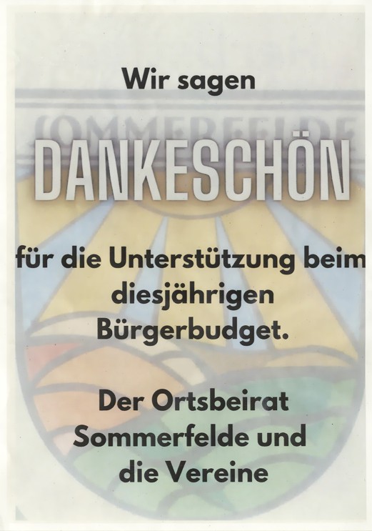 | Danke, Danke vielen Dank Stimmauszählung zum Bürgerhaushalt Liebe Sommerfelder! Bei der Stimmauszählung zum Bürgerhaushalt 2022 am 11.09.2021 konnten wir dank Ihrer Mithilfe mit 632 Stimmtalern den 5. Platz erringen. Die Fördersumme dient der weiteren Gestaltung unseres Dorfgemeindehauses und dem Festplatz. |