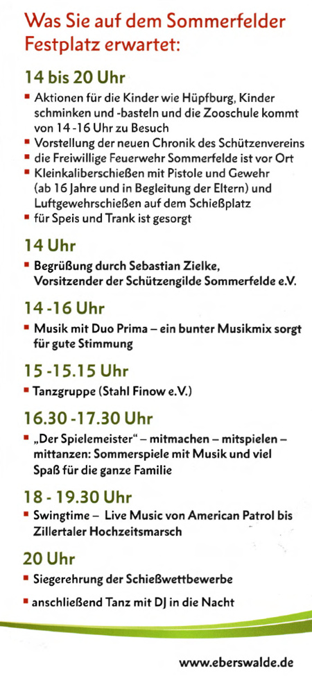 | 707 Jahre Sommerfelde und 140 Jahre Schützengilde Termin: Sa. 14. Juni 2014 Beginn: ab 14:00 Uhr Ort: Festplatz Sommerfelde Mehr Infos zu unserem traditionellen Schützenfest folgen oder einfach unter 0 33 34 / 24 697 bzw. 24 488 erfragen. Die Organisatoren |
