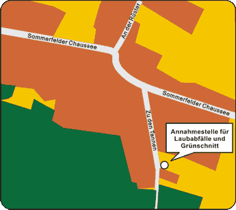 Grünabfällen Ab sofort besteht in der neu eingerichteten Annahmestelle die Möglichkeit, Grünabfälle aus Haus und Garten kostenfrei zu entsorgen. Die Annahmestelle befindet sich an der in der Karte mit dem Punkt gekennzeichneten Stelle. ![]() vorläufige Öffnungszeiten: Montag bis Freitag von 08:00 bis 20:00 Uhr Samstag von 08:00 bis 14:00 Uhr |